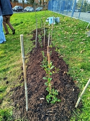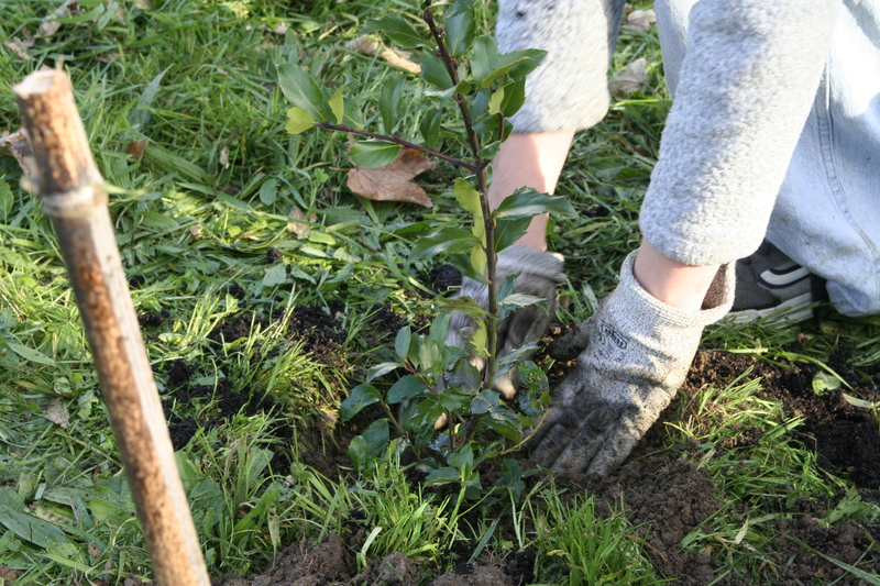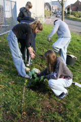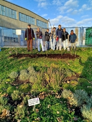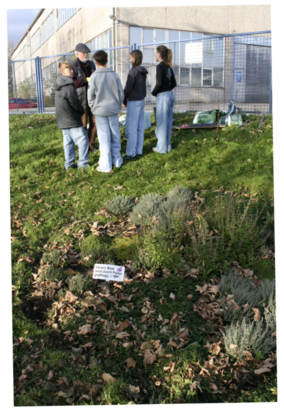 schülerinnen und Schüler ein Rondell mit Pflanzen, die für Bienen und Insekten interessant sind, angelegt. Anfang November pflanzten sie eine kleine Hecke aus Hülsen (Ilex, Stechpalme) unter dem